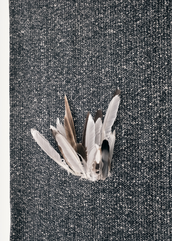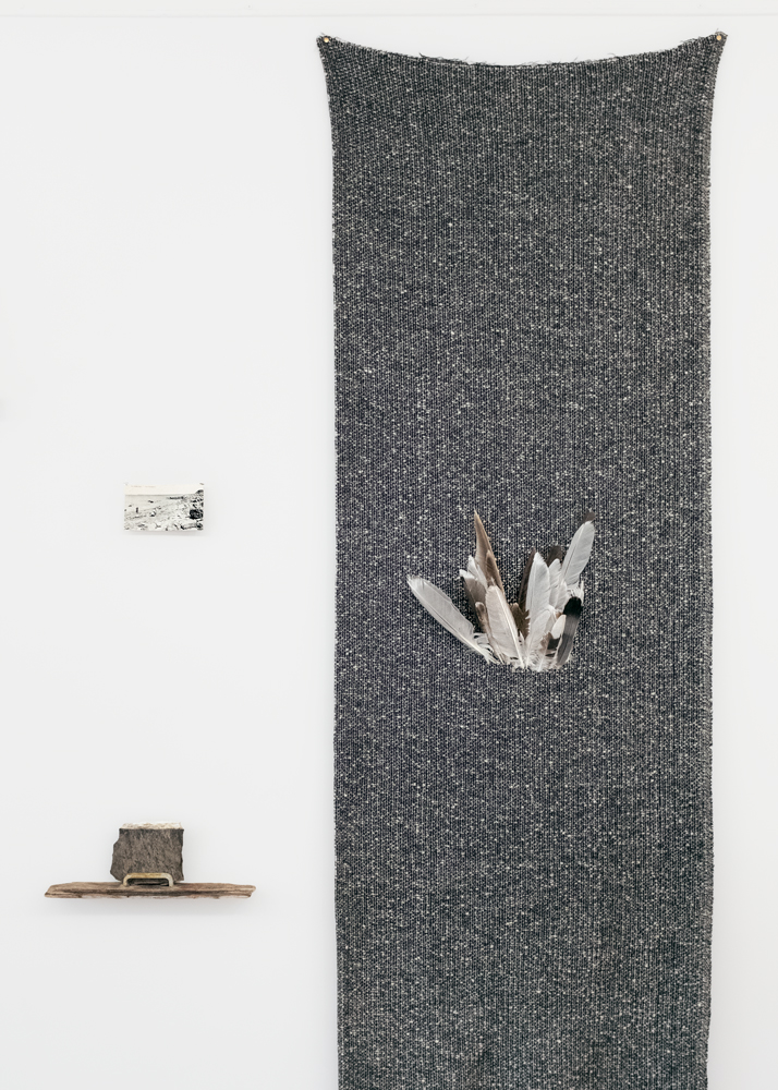 Installation, seagull feathers on fabric, old postcard, found stone on driftwood, ‘Arnordir’, 2024