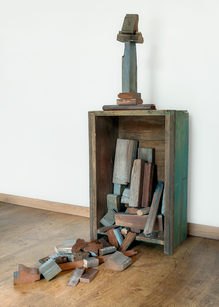 /// Jeu de construction dont les briques proviennent des chutes de bois issus du réemploi des anciennes fenêtres de la maison pour la création des cadres de l’exposition ‘La Calade’, 2025
