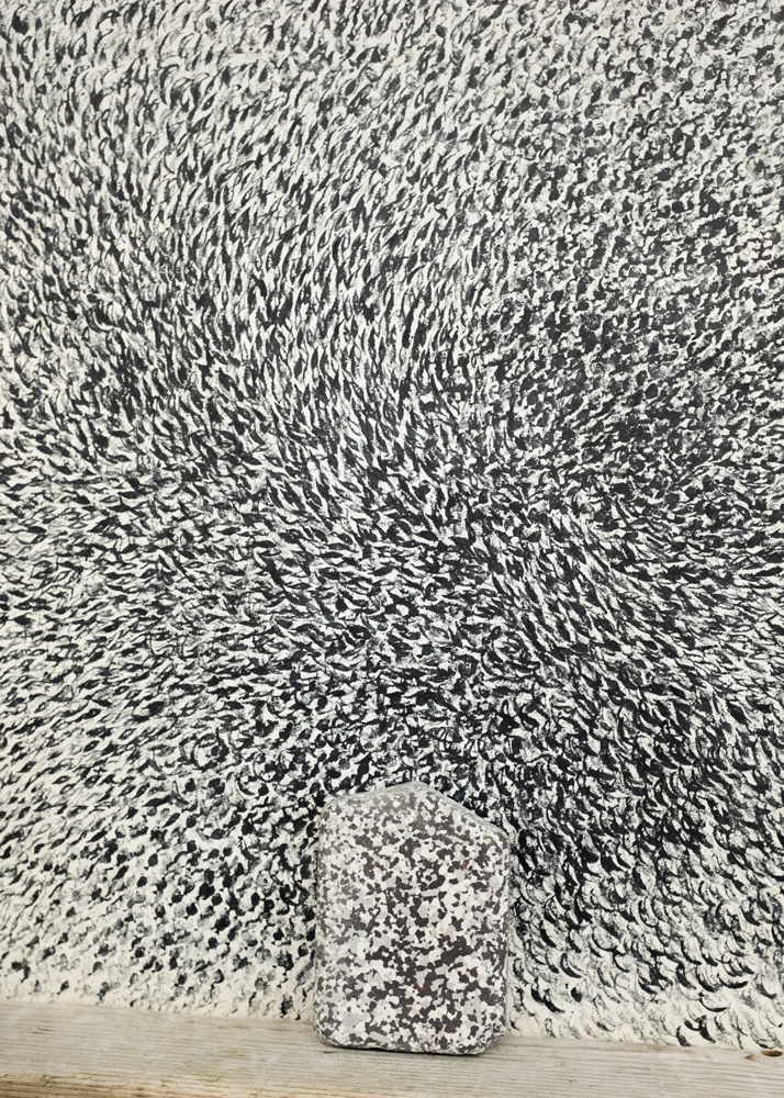 /// Dessin, encre de chine, pierre trouvée et flotteurs de pêche anciens, ‘Arnordir’, 2024